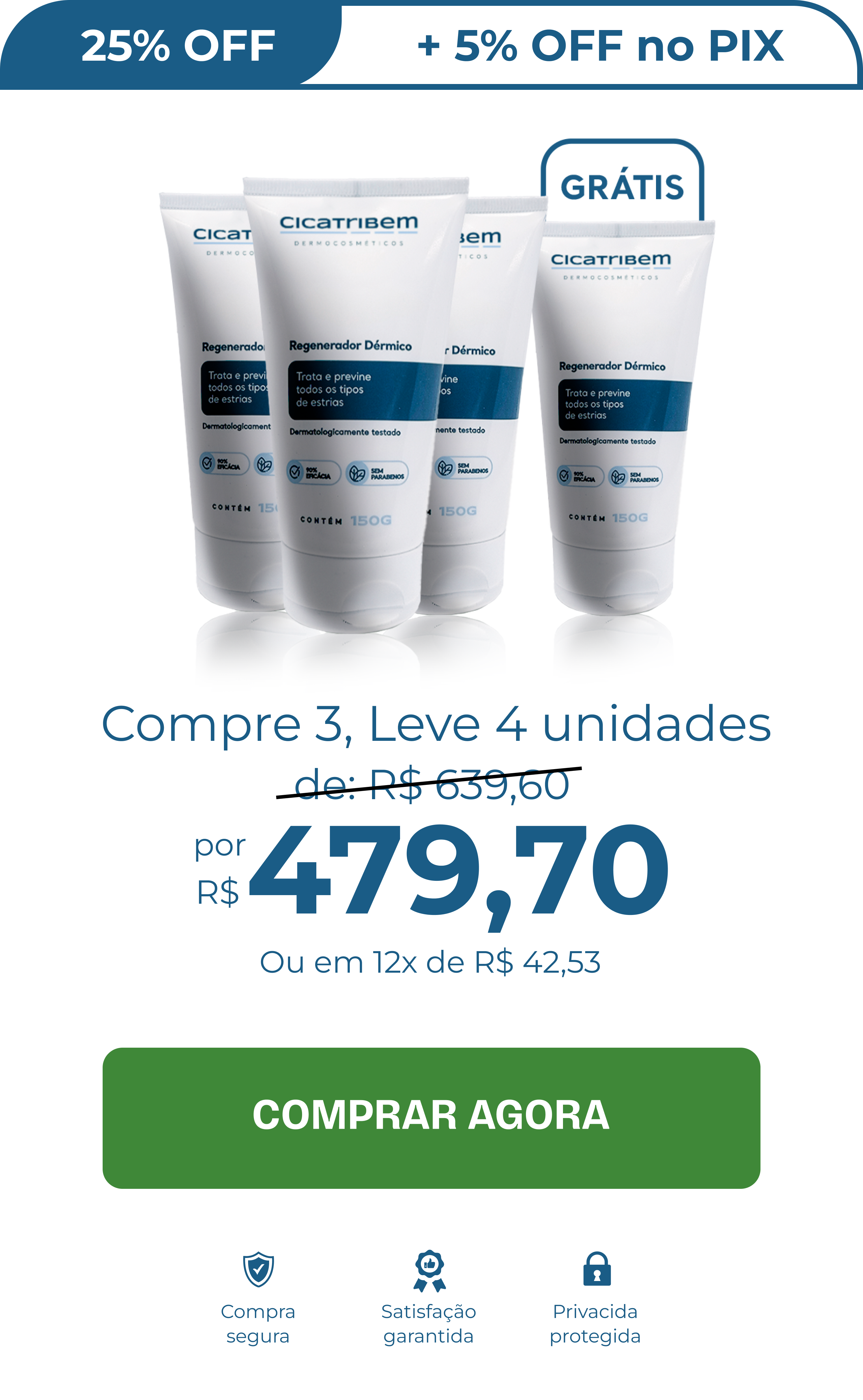 Não há efeitos colaterais ao consumir o produto. Não há qualquer contraindicação. Qualquer pessoa pode fazer uso e desfrutar de seus benefícios. Inclusive gestantes e lactantes, pois nosso produto não contém ácido em sua fórmula. O CICATRIBEM é Hipoalergênico, testado dermatologicamente.